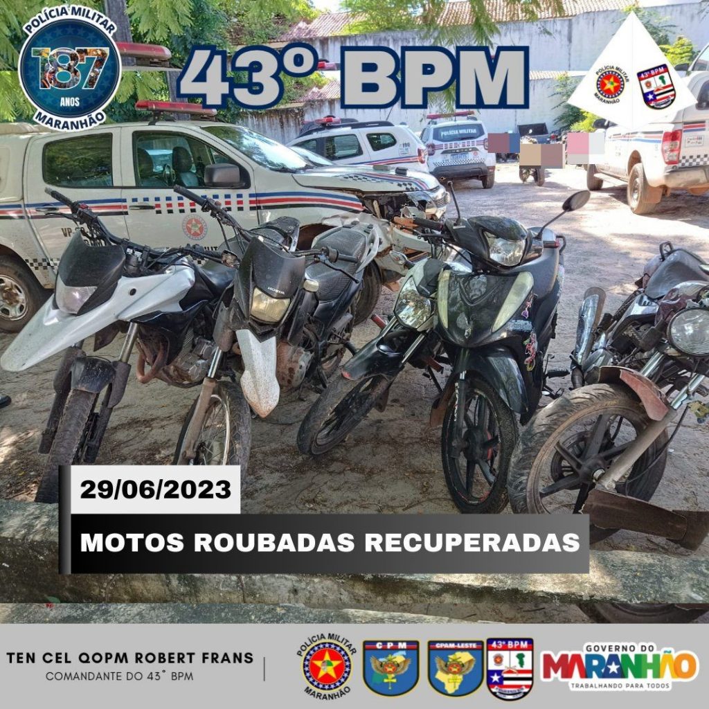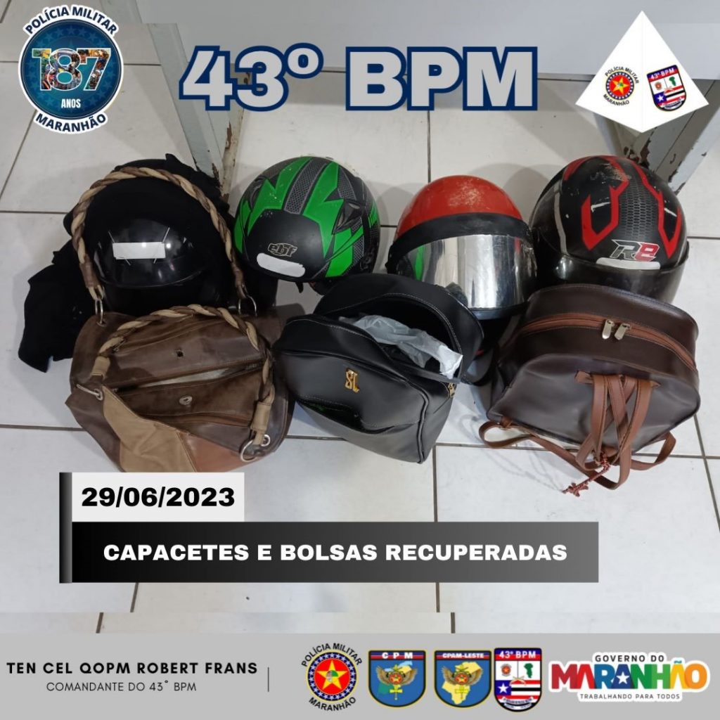 No inicio da manha de quinta-feira (29), policiais militares do 43º Batalhão prenderam uma quadrilha de assaltantes no Bairro Cruzeiro de Santa Barbara, em São Luís (MA). Na ação foi presos três homens e apreendido um simulacro de arma de fogo, uma arma branca e cinco motos. Foram recuperados 11 celulares provenientes dos assaltos do bando, além de bolsas femininas e documentos pessoais.