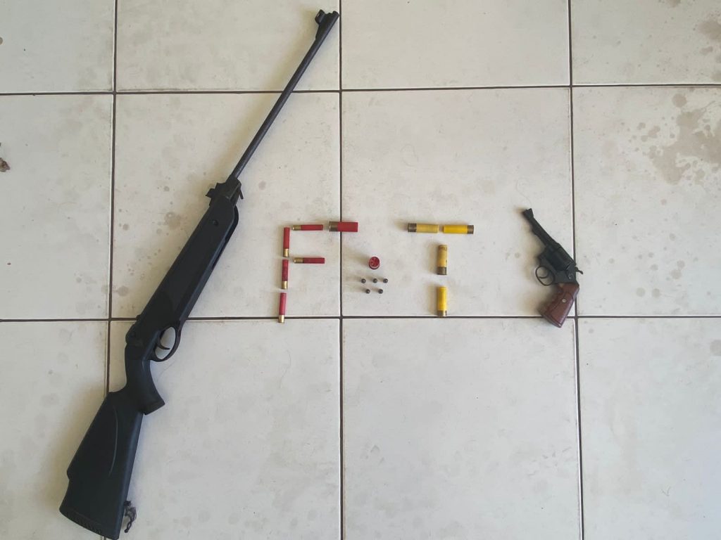 Por volta das 13h, a equipe da Força Tática realizou a prisão de um homem por utilizar uma arma de fogo para ameaçar sua esposa de morte no bairro Santa Terezinha. Os policiais apreenderam com o indivíduo, um Revólver Taurus, calibre .32, numeração 564124, carregado com 05 (cinco) munições calibre .32 intactos; uma Espingarda de pressão calibre 5.5mm, 04 (quatro) munições calibre .20, 02 (duas) munições calibre .12 e 05 (cinco) munições calibre .36, todas intactas.