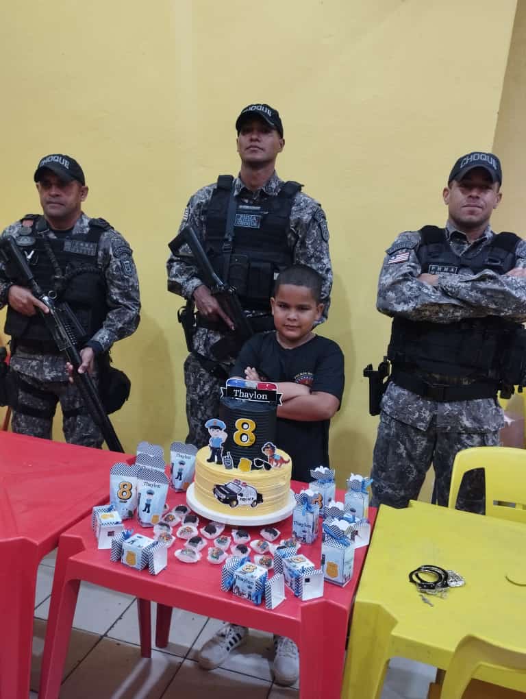 Para ele um dia muito especial e esperado, pois estava realizando um sonho: uma festa com o tema Polícia Militar. A decoração não poderia ser outra, bolo decorado com o tema e miniaturas de viaturas e equipamentos policiais.