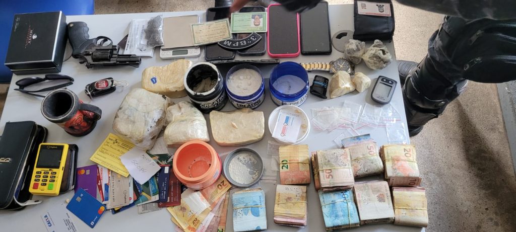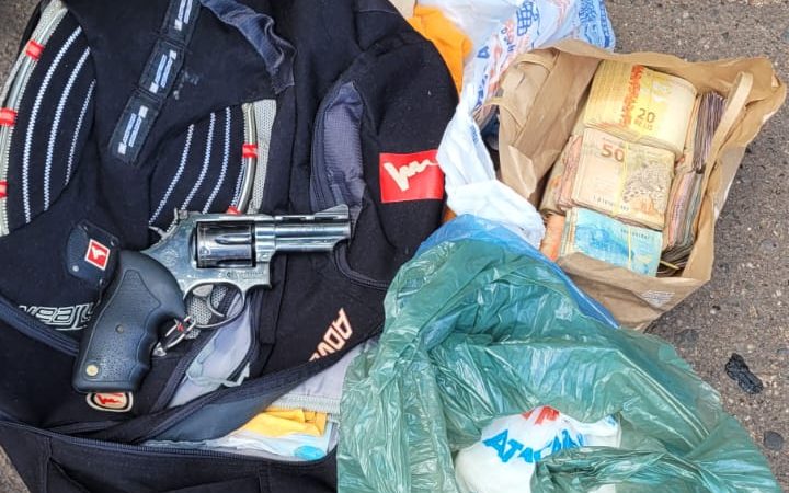 Ao realizar a revista no veículo, foi encontrado aproximadamente 2kg de substância similar à entorpecentes (pasta base de cocaína e maconha), vários maços de dinheiro, totalizando quase 20 mil reais, além de um revólver.