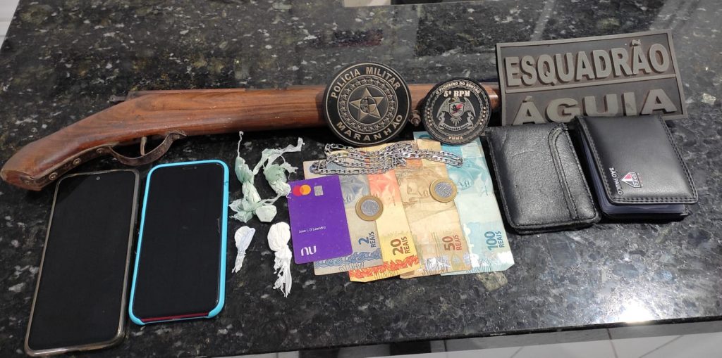 Durante a abordagem foi apreendido uma arma de fogo tipo espingarda de cano curto “bate bucha” e cinco papelotes de uma substancia semelhante a cocaína.