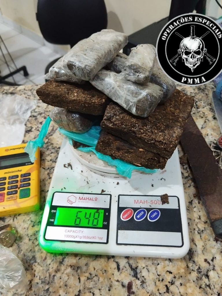 Ao realizaram a abordagem em um dos suspeitos que permaneceu na casa, apreendeu 648g de maconha que estavam em sua posse.