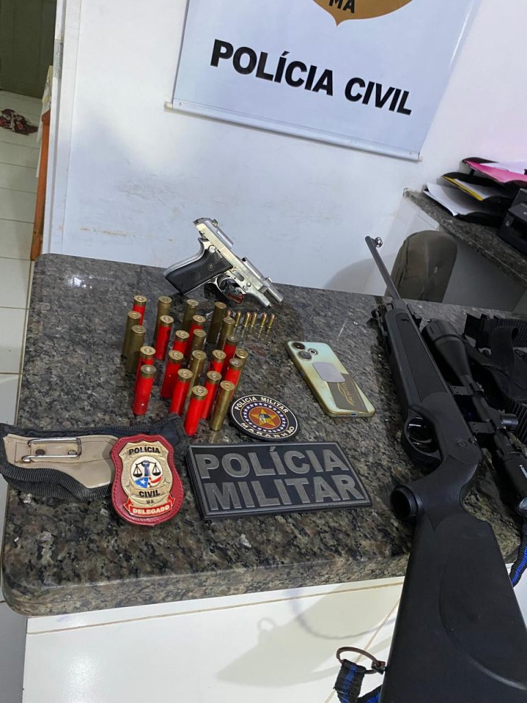 Ainda segundo o delegado, além do cumprimento do mandado de prisão preventiva, os policiais também deram cumprimento a um mandado de busca domiciliar na residência do suspeito. Durante as buscas, foi apreendida uma pistola calibre .380, totalmente municiada, bem como diversas munições calibre 28, que estavam escondidas no interior da descarga do banheiro de um dos quartos do imóvel.