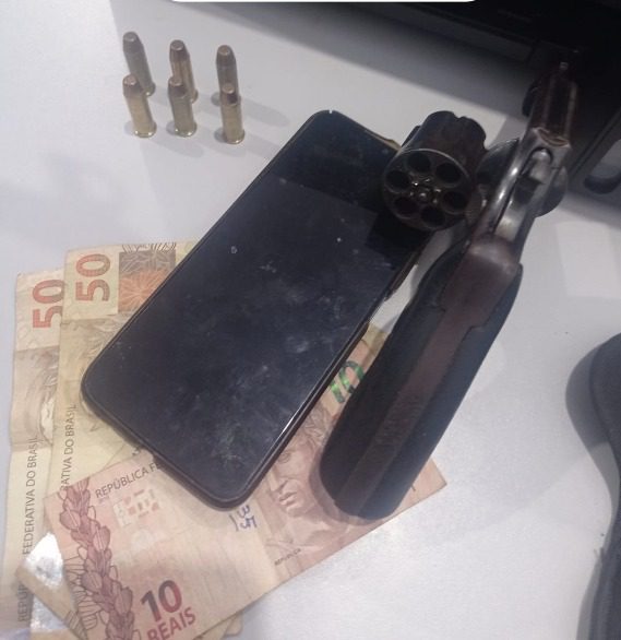 Durante a ação, os policiais constataram que o suspeito estava na posse de uma arma de fogo, um revólver calibre .38, municiado com seis cartuchos intactos, o que resultou também em sua autuação em flagrante pelo crime de posse ilegal de arma de fogo.